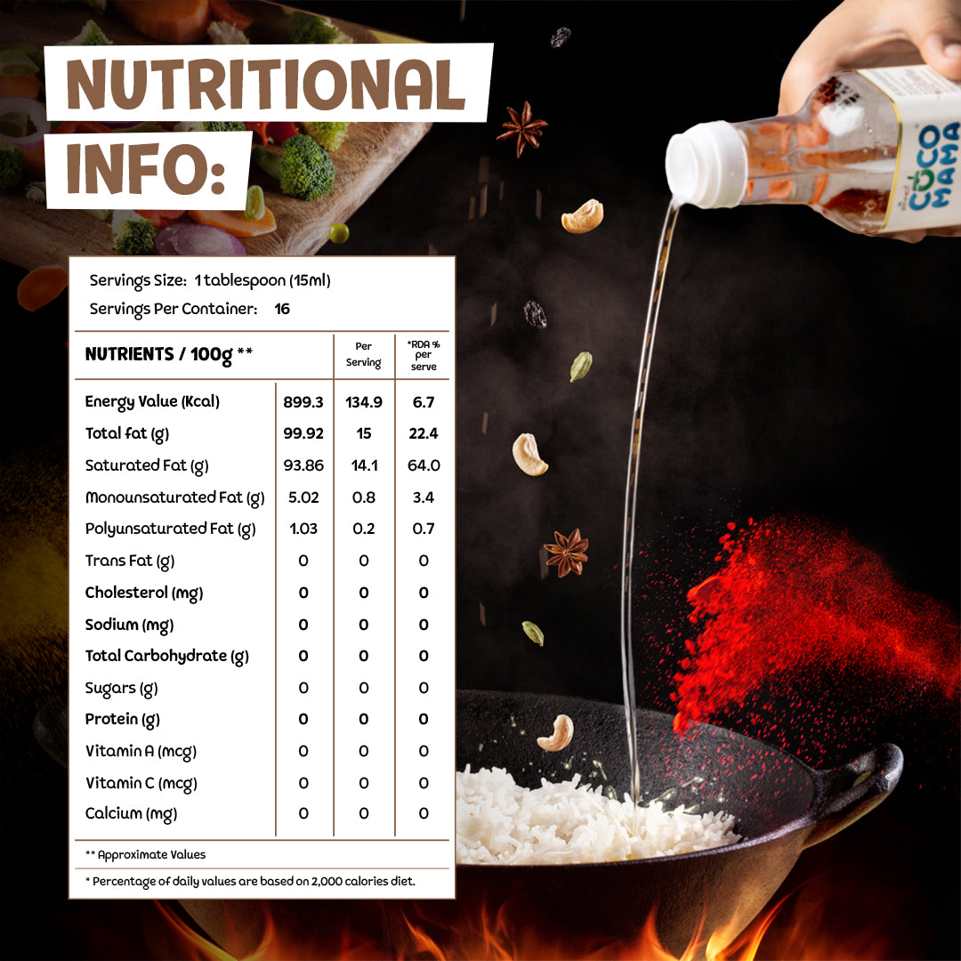 NUTRIENTS / 100ml* * *RDA % per serve (15ml) Energy value 899.3 Kcal 6.7 Total fat 99.92 g 22.4 Saturated fat 93.86 g 64.0 Monounsaturated fat 5.02 g 3.4 Polyunsaturated fat 1.03 g 0.7 Trans Fat 0 g 0 Cholesterol